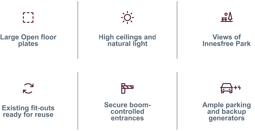 The buildings have large open floor plates, good ceiling heights, lots of natural light from large windows, views of the Innesfree Park and lush greenery, existing fit outs to be re-used, nice green break away areas,